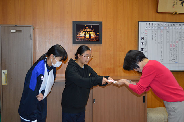 令和8年2月1日奈良県シダーアリーナで行われます第67回近畿高等学校柔道新人大会女子団体に出場が決まりました女子柔道部にお祝いを贈呈しました。
